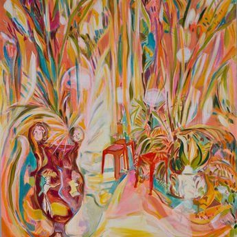 Her compositions dissolve interiors and exteriors into dreamlike spaces that resist linear perspective. Lush plants, abundant tables, and patterned surfaces move across vibrant grounds, creating environments that feel both domestic and wild—a garden filtered through recollection. Colour, light, and composition function as emotional structures, allowing painting to transform experience rather than simply represent it.